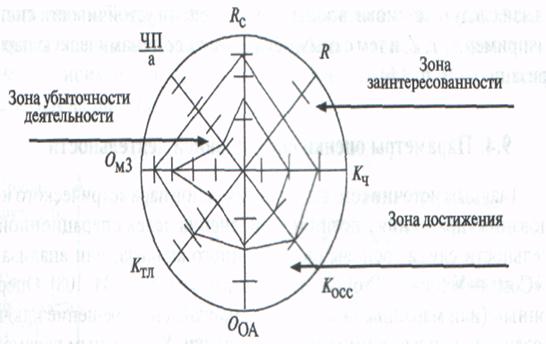 Накопление статистической информации о граничных значениях ряда параметров управления предприятием позволило исследователям перейти к N-мерной интерпретации его финансовой состоятельности. Для этого делается выбор показателей из каждой группы (рис. 30), характеризующей ту или иную сторону финансовой состоятельности предприятия, и по каждому показателю устанавливаются граничные значения успешной, убыточной и кризисной деятельности. Затем строится многомерная радиальная сеть, т.е. сеть, имеющая общую начальную точку «О» и состоящая из нескольких числовых осей, произвольно ориентированных на плоскости. Каждая числовая ось соответствует определенному параметру и, следовательно, имеет свой масштаб и диапазон изменения. На числовых осях наносятся точки по значениям критериев, определяющих зону заинтересованности организации в результатах как зону успешной работы и зону убыточной деятельности. По фактическим значениям параметров выстраивается зона достижимости. Сопоставление полученных геометрических фигур дает наглядную картину для оценки эффективности управления (рис.32).