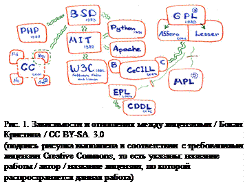 Вообще, лицензий открытых или закрытых существует великое множество (рис. 1). Для знакомства с лицензиями студентам предлагается два задания[10]. Во-первых, студент должен сделать доклад-презентацию о выбранной им лицензии и прослушать доклады о других лицензиях своих коллег. Во-вторых, добавить в статью Википедии об этой выбранной лицензии утверждение, подкреплённое ссылкой на авторитетный источник[11]. Созданные студентами слайды-презентации, посвящённые лицензиям, доступны онлайн[12].