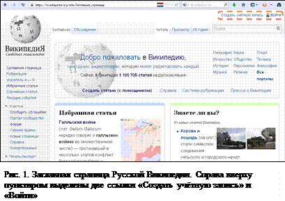 Серьёзное редактирование Википедии будет проще и удобнее, если вы зарегистрируетесь в проекте. Для этого войдите на любую страницу сайта Русской Википедии и справа вверху на экране выберите ссылку «Создать учётную запись» (рис. 3). Если вы уже зарегистрированы в проекте, то выберите ссылку «Войти» и введите свои логин и пароль. Обе этих ссылки («Создать учётную запись» и «Войти») обведены пунктиром на рис. 3.