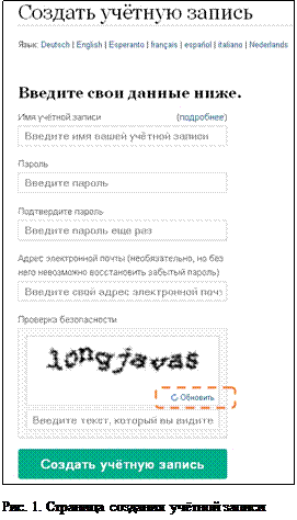 В самом низу, в поле ввода над кнопкой «Создать учётную запись» на рис. 4, нужно ввести трудночитаемый текст, написанный чуть выше (так называемая капча). Если текст действительно трудно прочитать, и вы сомневаетесь, что правильно его набрали на клавиатуре, то нажмите кнопку «Обновить» (кнопка обведена пунктиром на рис. 4). Нажимайте до тех пор, пока система не предложит вам изображение с достаточно чёткими символами. Только тогда вводите изображённый текст. Нажмите кнопку «Создать учётную запись». Учётная запись создана.