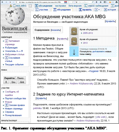 На рис. 7 дан фрагмент страницы обсуждения всё того же участника AKA MBG. На этом рисунке видно, что две разные темы обсуждений, инициированные разными участниками, имеют отдельные подразделы. Также хорошо видно, что в конце каждого сообщения участника стоит (1) имя участника (в виде ссылки на страницу участника), (2) время и (3) дата сообщения. Эти три элемента подставляются автоматически, если при редактировании указать четыре тильды подряд ~~~~, предварительно войдя в систему.
