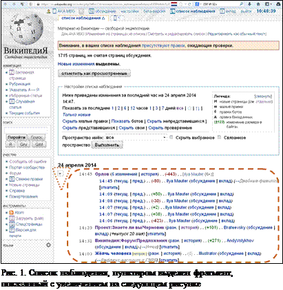 Сам список изменённых статей выделен пунктиром на рис. 10 и показан с увеличением на рис. 11. В этот список входит четыре страницы Википедии (рис. 11):