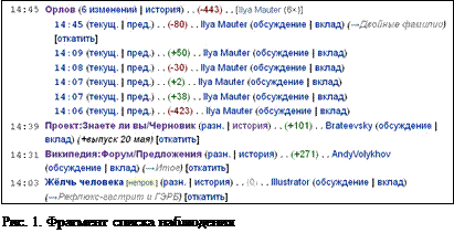 Первую статью (Орлов) в этом списке редактировали больше одного раза (всего в статье шесть изменений), поэтому на рис. 10 слева от названия и времени редактирования статьи (“14:45 Орлов”) находится кнопка в виде серого треугольника (для наглядности обведённого пунктирным треугольником), позволяющая при нажатии увидеть все шесть изменений. Эта кнопка была нажата, список раскрыт, и мы видим на рис. 11, что все изменения выполнены одним участником Ilya Mauter. Положительные и отрицательные цифры в скобках показывают, что при редактировании текст статьи то увеличивался, то уменьшался, и в итоге уменьшился на 443 байта. Первое изменение было сделано в 14:06, последнее в 14:45 (рис. 11).
