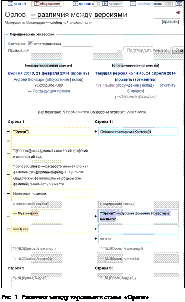 При нажатии на эту ссылку открывается страница изменений статьи «Орлов» (рис. 12). Здесь слева изображён исходный викитекст и справа текст после шести изменений, внесённых участником Ilya Mauter. На странице сравнения версий (рис. 12) видно, что были удалены второй и третий абзац и заменены строкой «{{о|дворянском роде|Орловы}}».