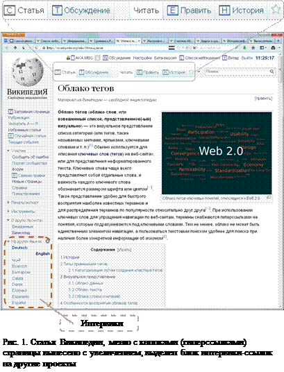 Ссылки на другие языковые разделы (интервики) выделены на рис. 14 пунктиром слева-внизу. По этим ссылкам можно перейти в статью “Tag cloud” в Английской Википедии, в статью “Schlagwortwolke” Немецкой Википедии и т.д. и прочитать статьи про те же самые «облака тегов». Легко убедиться, что эти статьи не только не являются точным переводом, но и не совпадают по объёму текста.