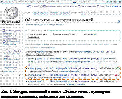 На рис. 15 в истории изменений статьи «Облако тегов» поместилось четыре версии изменений. Пунктиром выделены две активные версии, выбранные с помощью нажатия кнопок, расположенных слева от времени, даты и автора правки: