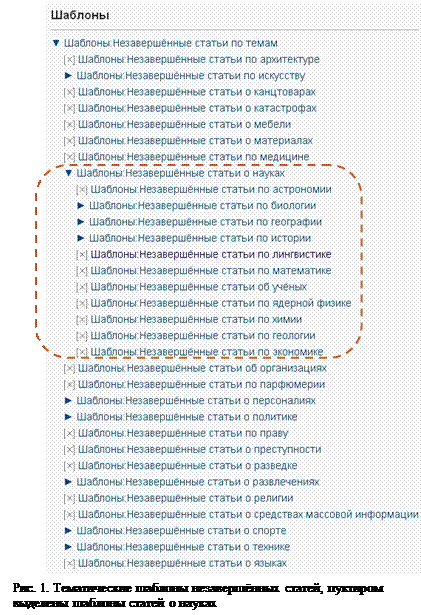 2. на рис. 19 нажатием на символ треугольника (слева) раскрыт выпадающий список шаблонов «Незавершённые статьи о науках» (выделен пунктиром). При выборе ссылки (например, «Шаблоны:Незавершённые статьи по лингвистике») попадаем на страницу со списком шаблонов для статей заготовок по данной дисциплине (9 шаблонов по лингвистике). Далее при выборе конкретного шаблона {{Linguist-stub}} попадаем на страницу шаблона, который указывается в статьях-заготовках о лингвистах[79]. Далее нажмите кнопку в левом меню «Ссылки сюда», откроется страница со всеми статьями-заготовками о лингвистах. Эти статьи и требовалось найти.