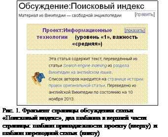 Например, на странице обсуждения статьи Россия[125] указано, что статья «Россия» отнесена к двум проектам —«Проект:Россия» и «Проект:Страна в темах». Указан уровень качества текущей версии статьи по шкале оценок и указана степень важности темы статьи для каждого из проектов.