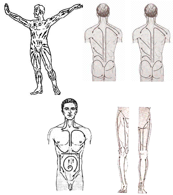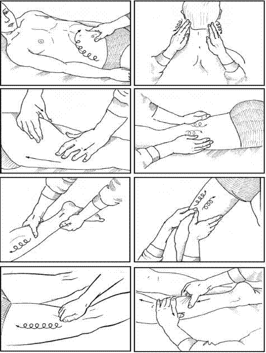 Самомассаж. Во время проведения самомассажа следует придерживаться тех же правил и той же последовательности приемов, что и при выполнении классического массажа. Движения рук должны идти по направлению кровотока к ближайшим лимфатическим узлам. Массировать лимфатические узлы нельзя. Тело во время массажа следует максимально расслабить, поэтому необходимо выбрать такое положение, чтобы избежать лишнего напряжения. Если проведение самомассажа преследует лечебные цели, например, при растяжении связок, при вывихе, ушибах, болях в пояснице, в этом случае необходима предварительная консультация с врачом. Проводить самомассаж можно в парилке. Здесь мышцы становятся рыхлыми и удобными для глубокой проработки. Но, находясь в парной, следует массировать только небольшие участки тела – коленный и плечевой суставы, кисти и т. д. В случае если посещение парилки противопоказано, самомассаж проводится после принятия горячего душа или ванной. Самомассаж не должен состоять из большого числа приемов. Лучше всего ограничиться теми из них, которые удобны в выполнении и наиболее полезны для данного участка тела или сустава. На бедре, голени и на животе самомассаж можно делать двумя руками. Перед проведением самомассажа следует хорошенько намылить руки мылом, желательно детским. Самомассаж делится на частный и общий. Проведение общего самомассажа следует начинать с бедра, переходя затем к коленному суставу и голени. Промассировав ноги, можно переходить к самомассажу груди, шеи, рук, широчайших мышц спины, живота. Заканчивается процедура массированием тазобедренной области, поясницы, спины и головы.