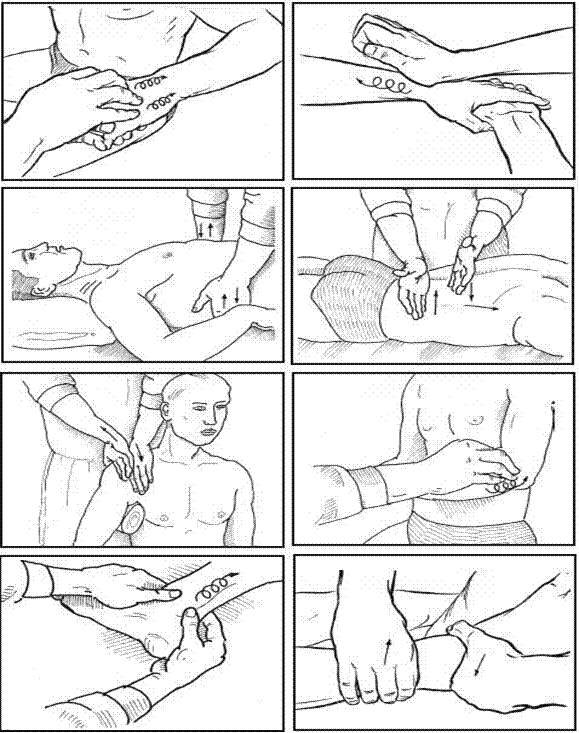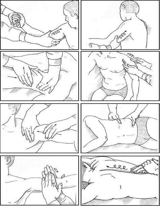 Массаж рук. Во время проведения этого массажа руки должны лежать вдоль туловища. Воздействие начинается с массирования внутренней поверхности рук. Ребром ладони 3–4 раза выполняется выжимание. Затем производится ординарное и двойное кольцевое разминание (3–4 раза каждый прием). Прием разминания необходимо чередовать с выжиманием и потряхиванием. Те же приемы массажа выполняются и на внешней стороне рук. Если во время массажа рук массируемый лежит на спине, то процедуру следует начать с плеча, а затем перейти к предплечьям и кистям.