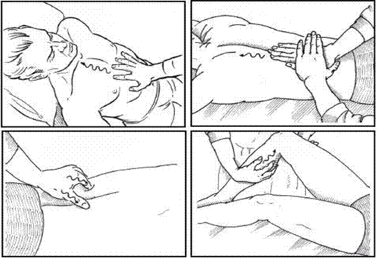 Поглаживание. Прием выполняется ладонью. Для охвата большей площади поверхности тела следует соединить вместе четыре пальца руки, а пятый, большой, отвести в сторону. Ладонь надо плотно прижать к телу массируемого, но при этом – сильно не давить на него. Движения должны быть медленными, ритмичными и легкими. Выполнять поглаживание можно одной рукой или обеими по очереди: одна рука следует за другой, повторяя ее движения или выполняя какие–либо другие, например, одна рука делает прямолинейные движения, другая – зигзагообразные. Прием поглаживания выполняется в течение 2–3 минут.