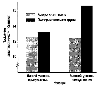Рис. 2.5. Когда высокому самомнению брошен вызов, только люди с завышенной самооценкой, чувствуя, что ей грозит опасность, начинают вести себя значительно более враждебно — высокомерно, грубо и недружелюбно. (Источник: Heartherton & Vohs, 2000)