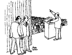 (— Какой ужас! Эти избиратели — рабочие, а он читает речь, предназначенную для менеджеров!)