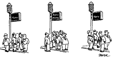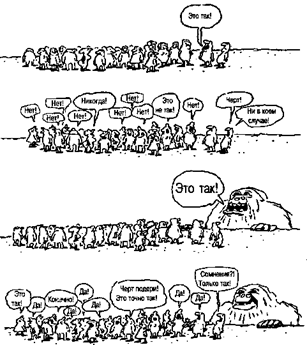 Вам наверняка знакома такая ситуация: как только оратор, высказывавший спорные идеи, или музыкальный ансамбль заканчивают выступление, фанаты, сидевшие в первых рядах, встают и начинают хлопать в ладоши. Поклонники, сидящие чуть дальше, следуя их примеру, тоже поднимаются со своих мест, аплодируя. И вот волна стоящих людей докатывается до тех, кто в другой ситуации, не вставая со своих удобных кресел, вполне мог бы ограничиться вежливыми хлопками. Вы сидите среди этих людей, и какая-то часть вас не хочет вставать («Я совершенно не согласен с тем, что говорил этот оратор»). Но останетесь ли вы сидеть, если и сидящие вокруг вас тоже встанут? Быть «белой вороной» нелегко.
