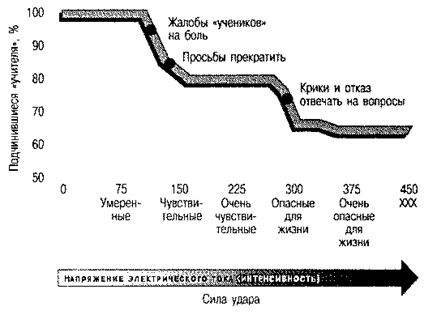 Если «учитель» подчиняется приказам экспериментатора, он при 75, 90 и 105 вольтах слышит стоны «ученика». При 120 вольтах «ученик» кричит, что ему больно. При 150 вольтах умоляет избавить его от мучений: «Экспериментатор, выпустите меня отсюда! Я не хочу больше участвовать в вашей работе! С меня хватит!» При 270 вольтах его протест выливается в вопли агонизирующего человека, и он продолжает требовать, чтобы его выпустили. В интервале от 300 до 315 вольт он кричит, что отказывается отвечать, а после 330 наступает тишина. В ответ на просьбу «учителя» прекратить эксперимент исследователь говорит, что отсутствие ответа будет приравнено к неверному ответу, и, чтобы заставить его продолжать, использует четыре фразы.