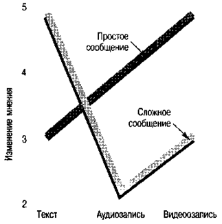 Рис. 7.8. Простые сообщения наиболее убедительны в форме видеозаписи, сложные — в печатном виде. Следовательно, окажется ли средство массовой информации убедительным, зависит от того, соответствует ли оно по форме сложности содержания передаваемого сообщения. (Источник:Chaiken & Eagly, 1978)