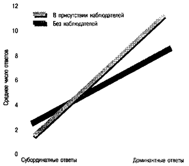 Рис. 8.1. Социальная фасилитация доминирующей реакции. В присутствии наблюдателей испытуемые чаще «видели» доминантные слова (те, которые они произносили 16 раз) и реже — субординатные слова, т. е. те, которые они произносили не более одного раза. (Источник:Zajonc & Sales, 1966)
