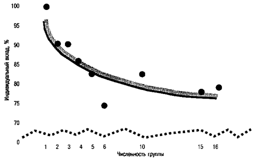 Рис. 8.4. Результаты статистического метаанализа 49 исследований, в которых приняли участие 4000 испытуемых, показывают: по мере увеличения численности групп индивидуальный вклад уменьшается, т. е. возрастает уровень социальной лености. Каждая точка соответствует обобщенным результатам одного из этих исследований. (Источник:Williams, Jackson & Karau. В книге «Social Dilemmas: Perspectives on Individuals and Groups». Ed. D. A. Schroeder, 1992, Praeger)