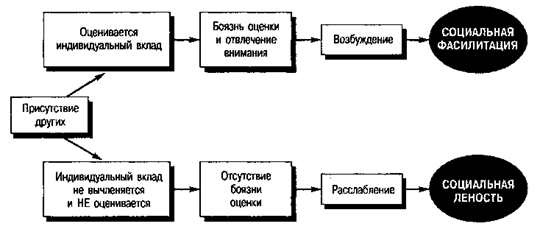 В экспериментах, которые проводятся для изучения социальной лености, испытуемые убеждены, что их оценивают только тогда, когда они действуют в одиночку. Коллективные действия (перетягивание каната, крики, аплодисменты и т. п.) уменьшают боязнь оценки. Когда люди ни за что не отвечают и не могут оценить собственные усилия, ответственность распределяется между членами группы (Harkins & Jackson, 1985; Kerr & Bruun, 1981). В экспериментах по изучению социальной фасилитации ситуация диаметрально противоположна: боязнь оценки возрастает. Становясь объектом внимания, люди внимательно следят за своим поведением (Mullen & Baumeister, 1987). Иными словами, «работает» один и тот же принцип: когда человек оказывается в центре внимания, его беспокойство о том, как его оценят, возрастает, при этом имеет место социальная фасилитация. Когда же у человека появляется возможность «затеряться в толпе» и вследствие этого уменьшается забота об оценке, проявляется социальная леность (рис. 8.5).
