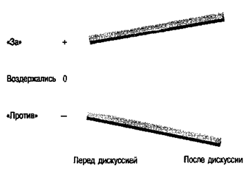 Рис. 8.8. Гипотеза групповой поляризации прогнозирует, что в результате дискуссии мнение, разделяемое членами группы, усиливается