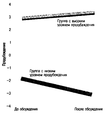 Заинтересовавшись этим, мы с Джорджем Бишопом пригласили для участия в своих экспериментах учащихся средних школ (с большей или меньшей склонностью к расовой дискриминации) и попросили их ответить — до обсуждения и после него — на вопросы, затрагивающие расовые установки, например: что они поддерживают — право собственности или запрет на расовую дискриминацию при продаже и сдаче в аренду жилья (Myers & Bishop, 1970)? Оказалось, что обсуждение проблемы единомышленниками на самом деле увеличило разрыв, изначально существовавший между двумя группами (рис. 8.9).