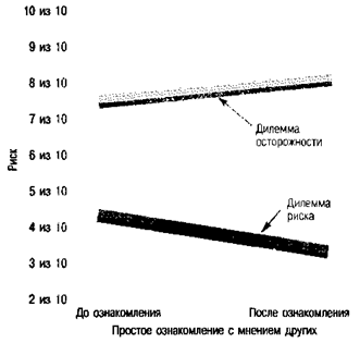 Рис. 8.10. Когда речь идет о таких «дилеммах риска», как дилемма Элен, одного лишь знакомства с мнениями других людей достаточно для того, чтобы позиция индивидуума «сдвинулась» в сторону риска. Что же касается «дилемм осторожности» (примером является дилемма Роджера), знакомство с мнениями окружающих делает людей более осторожными. (Источник:Myers, 1978)