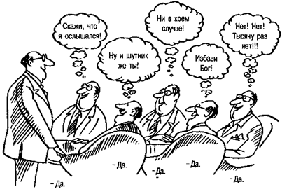 — Давление конформизма. Члены группы отвергают тех, кто выражает сомнения относительно представлений и планов группы, причем порой это делается не с помощью аргументов, а с помощью сарказма, направленного на конкретного человека. Однажды президент Джонсон так приветствовал своего помощника Билла Мойерса, пришедшего на совещание: «А вот и мистер Прекратите-Бомбить собственной персоной!» У большинства людей подобные насмешки отбивают всякую охоту возражать.