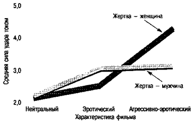 Хотя в лабораторных условиях исследователи имеют возможность наблюдать за поведением испытуемых в течение короткого периода времени, все же эксперименты, условия проведения которых контролируются, позволяют им выявлять причины и следствия. Результаты проведенной ими работы обобщены в заявлении, единогласно принятом 21 ведущим специалистом в области социальных наук: «Порнографические материалы, пропагандирующие насилие, усиливают агрессивное поведение в отношении женщин» (Koop, 1987). Один из этих ученых, Эдуард Доннерстейн, провел эксперимент, в котором приняли участие 120 мужчин из Университета штата Висконсин (Donnerstein, 1980). Разделив испытуемых на три группы, он показал одной из них нейтральный фильм, другой — эротический и третьей — агрессивно эротический со сценой изнасилования. Затем испытуемые, якобы в рамках нового эксперимента, «обучали» помощника экспериментатора (мужчину или женщину) бессмысленным слогам; за неправильные ответы «учеников» наказывали ударами электрического тока. Мужчины, смотревшие фильм со сценой изнасилования, наказывали нерадивых «учеников» значительно более жестоко, особенно если злились и если «жертвой» была женщина (рис. 10.7).