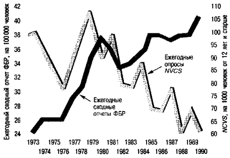 По данным общенационального опроса жертв преступлений (National Crime Victimization Survey — NCVS),который был проведен Бюро переписи населения по заказу Бюро судебной статистики и который проводится ежегодно с 1973 г., преступность не увеличилась ни на йоту. Несмотря на пугающий образ насилия, создаваемый телевидением, несмотря на огромное количество преступлений, связанных с употреблением наркотиков, этот опрос семей, отобранных по случайному принципу, убеждает нас в обратном: все не так плохо. Если верить опросу, начиная с 1973 г. количество изнасилований в стране падает (рис. 10.9).