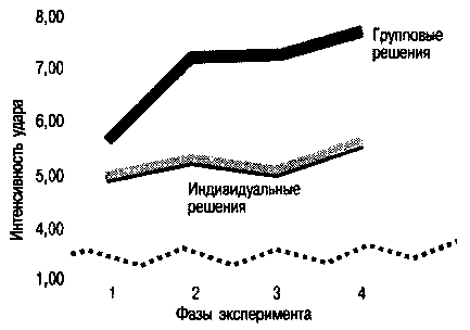 Рис. 10.11. Вмешательство группы усиливает агрессию индивида. По мере того как эксперимент приближался к завершению, индивиды предлагали наказывать за неверные ответы все более и более сильными ударами тока. Когда в процесс принятия ими решения вмешивалась группа, эта тенденция усиливалась. (Источник:Jaffeet al., 1981)