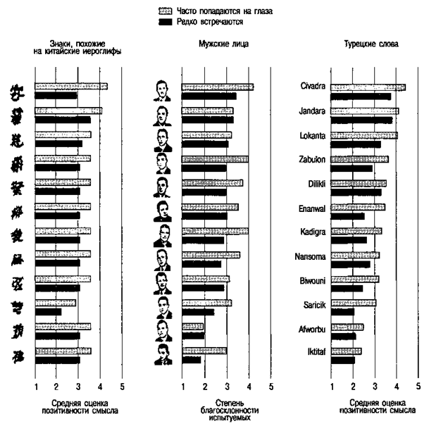 Я убедился в том, что на базе стимульного материала Зайонца можно провести остроумный демонстрационный опыт. Достаточно периодически предъявлять на экране (в режиме мелькания) некоторые бессмысленные слова, и к концу семестpa студенты будут оценивать их более позитивна, чем те столь же бессмысленные слова, которых они прежде никогда не видели.