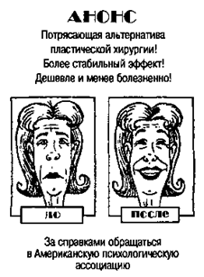 (Анонс. «Потрясающая альтернатива пластической хирургии! Более стабильный эффект! Дешевле и менее болезненно!» За справками обращаться в Американскую психологическую ассоциацию)