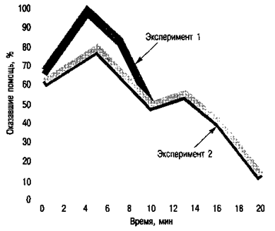 Второй эксперимент, проведенный Элис Айзен, Маргарет Кларк и Марком Шварцем (Isen, Clark & Schwartz, 1976), заключался в следующем: помощник экспериментатора звонил людям, которые не позднее чем за 20 минут до его звонка получали в подарок канцелярские принадлежности. Сказав, что ошибся номером и что у него больше нет мелочи для автомата, он просил ответившего ему человека оказать любезность и перезвонить по нужному ему номеру. Как следует из данных, представленных на рис. 12.5, в течение первых 5 минут после получения подарка готовность прийти на помощь растет, а затем — по мере того как «улетучивается» хорошее настроение — идет на убыль.
