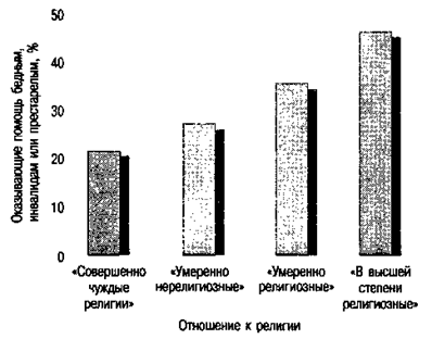 Религиозные студенты колледжей посвящают больше времени помощи отстающим, больным и участию в кампаниях за социальную справедливость, чем их нерелигиозные товарищи (Benson et al., 1980; Hansen et al., 1995). В настоящее время 46% тех, кого Джордж Гэллап (Gallup, 1984) назвал «в высшей степени религиозными», систематически оказывают помощь бедным, инвалидам и престарелым; среди тех, кто «совершенно чужд религии», доля помощников составляет только 22% (рис. 12.6).