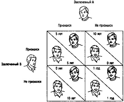 Эта дилемма почерпнута из истории о двух подозреваемых, которых окружной прокурор допрашивал по отдельности (Rapoport, 1960). Оба виновны в совершении одного и того же преступления, но у прокурора есть лишь доказательства их причастности к менее тяжкому преступлению. И он предлагает каждому наедине сознаться на выгодных условиях: если сознается только один, тому, кто сознается, прокурор гарантирует освобождение от наказания (и использует его признание для того, чтобы приговорить второго к максимальному сроку). Если сознаются оба, оба будут приговорены к средним срокам заключения. Если никто не сознается, оба получат минимальное наказание. В обобщенном виде все эти варианты представлены в виде матрицы на рис. 13.1. А вы сами признались бы, если бы перед вами стояла такая дилемма?