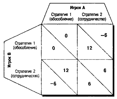 Рис. 13.2. Лабораторная версия дилеммы заключенного. Числами обозначено некое вознаграждение, например деньги. Числа в квадратах над диагональю — выигрыш игрока А