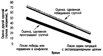 Может быть, эксперименты Шерифа — всего лишь детская забава? Или совместная работа ради достижения экстраординарных целей может столь же благотворно подействовать и на конфликтующих взрослых? На этот вопрос попытались ответить Роберт Блейк и Джейн Мутон (Blake & Mouton, 1979). В ряде экспериментов (в них приняли участие 150 разных групп управленцев общей численностью более 1000 человек; эксперименты продолжались в течение 2 недель) они воспроизвели принципиальные особенности эксперимента Шерифа, его сценарий. Сначала каждая группа работала самостоятельно, затем соревновалась с одной из групп и, наконец, в сотрудничестве с другой группой работала над достижением выбранных сообща экстраординарных целей. Результаты, полученные Блейком и Мутон, «недвусмысленно свидетельствуют о том, что реакции взрослых аналогичны реакциям подростков, участвовавших в эксперименте Шерифа».