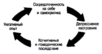 Исследователь Питер Левинсон и его коллеги, обобщив эти результаты, предложили стройную психологическую трактовку депрессии (Lewinsohn et al., 1985). Согласно их представлениям, негативный Я-образ, атрибуции и ожидания человека, пребывающего в состоянии депрессии, — важный элемент порочного круга, начало которому кладет негативный опыт в виде академической или профессиональной неудачи, семейного конфликта или социальной изоляции (рис. А.2). Людей, склонных к депрессии, подобные стрессы подталкивают к грустным размышлениям, к сосредоточенности на себе и обвинениям в свой адрес (Pyszczynski et al., 1991; Wood et al., 1990a, b). Подобные размышления создают депрессивное настроение, кардинально изменяющее ход мыслей человека и его поступки, которые, в свою очередь, «подливают масла в огонь» последующих негативных событий, самокритики и депрессивного состояния. В лабораторных экспериментах настроение людей в состоянии несильной депрессии улучшалось, когда при выполнении задания их внимание переключалось на какой-нибудь внешний стимул (Nix et al., 1995). (Судя по всему, для счастья нужна сосредоточенность на чем-то другом, а не на самом себе.) Следовательно, депрессия — это и причина, и следствие негативного мышления.