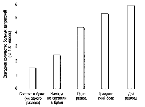 Рис. А.6. Семейное положение и депрессия. Результаты опроса, проведенного Национальным институтом психического здоровья для выявления психологических расстройств, свидетельствуют о том, что одинокие люди в 2-4 раза чаще страдают депрессией. (Источник:Robins & Regier, 1991, p. 72)