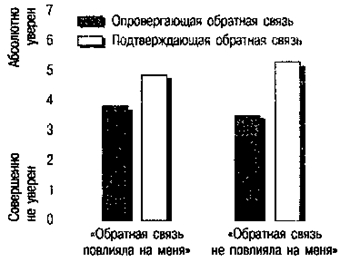 Эксперимент дал два поразительных результата. Во-первых, реакция экспериментатора оказала огромное влияние на испытуемых: оценивших свою уверенность 6-7 баллами среди тех, кого он поддержал, было в 4 раза больше, чем среди тех, на кого он вообще не отреагировал (среди последних оценивших свою уверенность 6-7 баллами было только 14%), и в 11 раз больше, чем среди тех, кого он опроверг (среди последних оценивших свою уверенность 6-7 баллами было только 5%). Если бы после получения обратной связи возросла уверенность тех испытуемых, которых экспериментатор поддержал, нас это не удивило бы, но в данном эксперименте участники оценивали свою уверенность в момент, предшествовавший получению обратной связи от экспериментатора.