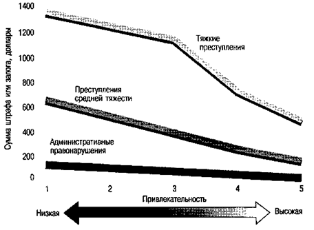 Рис. Б.5. Внешняя привлекательность и судебные решения. Подсудимым с менее привлекательной внешностью судьи с северного побережья Мексиканского залива (штат Техас) назначают более высокие штрафы и залоговые суммы. (Источник:Downs & Lyons, 1991)