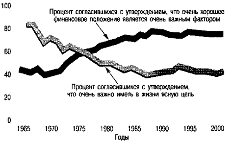 Расцвет материализма пришелся на 1970-е-1980-е гг. Наибольшее впечатление производят результаты ежегодных опросов, проводимых совместно Калифорнийским университетом в Лос-Анджелесе и Советом по образованию среди примерно 250 000 первокурсников. Количество согласившихся с утверждением, что «очень важной» причиной их поступления в колледж является желание «больше зарабатывать», возросло с 50% в 1971 г. до почти 75% в 2000 г. А количество полагающих «очень хорошее финансовое положение» «самым важным» фактором возросло с 39% в 1970 г. до 74% в 2000 г. (рис. В.2). По сути, эти данные свидетельствуют о катастрофическом уменьшении числа молодых людей, считающих, что «в жизни должна быть ясная цель». Материализм одержал победу над духовностью.