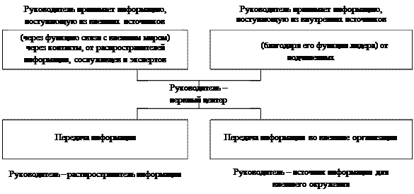 | Распространитель информации | Передает информацию, полученную из внешних источников или от других подчиненных, членам организации; часть этой информации носит чисто фактический характер, другая требует интерпретации отдельных фактов для формирования взглядов организации | Рассылка почты по организациям с целью получения информации, вербальные контакты для передачи информации подчиненным (обзоры, беседы) |