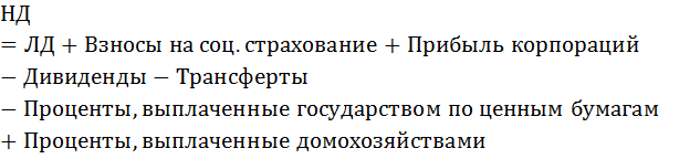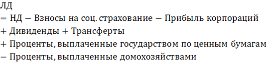 3) Личный доход (personal income – PI) рассчитывается также как разность между НД и всем тем, что не поступает в распоряжение домохозяйств и является частью коллективного, а не личного дохода, и добавить всё то, что увеличивает доходы домохозяйств, но не включается в НД: