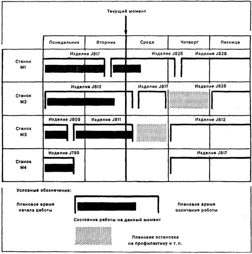 В качестве примера инструмента оперативного управления производством на рис. 21.4. приведен УЧЕТНО-ПЛАНОВЫЙ ГРАФИК ГАНТА, который можно использовать на всех этапах оперативного управления производством: при планировании, диспетчеризации, выдаче нарядов на работу, контроле сроков выполнения работ. На нем вертикальными линиями представлено время, выполняемые работы откладываются по горизонтали. В приведенном примере график отражает состояние производства на конец рабочего дня во вторник. График показывает, что изделие J826 на станке Ml идет с опережением, обработка изделия J811 на станке МЗ завершена досрочно, обработка изделия J812 на станке М2 запаздывает. Станок М2 и МЗ планируется остановить на профилактику. Станок М4 в настоящее время простаивает и обработку изделия J812 на нем нельзя начать до тех пор, пока не завершится обработка этого изделия на станке М2. График Ганта в одной из его многочисленных форм обычно можно встретить на небольших предприятиях или в отдельных подразделениях крупных компаний. В более сложных случаях, при большом количестве обрабатываемых изделий или единиц используемого технологического оборудования, можно использовать компьютерную версию графика Ганта.
