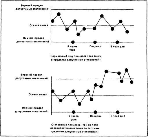 Метод контроля технологического процесса можно использовать как в сфере предоставления услуг, так и в сфере производства. Пример карты технологического контроля приведен на рис. 21.9. В течение дня в произвольные моменты из процесса отбирают три пробы. В данном случае считается, что процесс нарушен, если три из пяти последовательных образцов вышли за пределы допустимых отклонений.