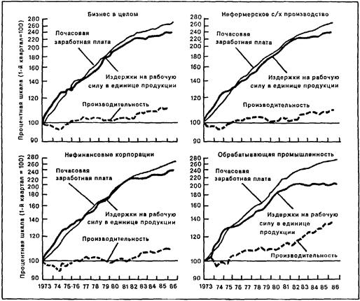 РОСТ СФЕРЫ УСЛУГ. Одной из причин отставания Соединенных Штатов в области эффективности национальной экономики может быть быстрый рост значения сферы услуг. Многие знают, что из-за влияния менее эффективной технологии в сфере услуг выработка в долларах на одного работника ниже чем в производственном секторе. Количество человеко-часов в производстве упало с одной трети от общего количества в конце 60-х годов до одной четверти в настоящее время. (Сегодня менее 9% рабочих заняты непосредственно в промышленности.) В связи с таким изменением пропорций, рост факторной производительности в США в целом выглядит более медленным, чем в тех странах, где промышленный сектор доминирует над сектором услуг. Следует заметить, что производительность в Америке может быть на самом деле несколько выше, чем показывают приводимые цифры, поскольку вся система ее оценки ориентирована на промышленность и может не совсем точно отражать рост производительности в сфере услуг. Во всяком случае ясно, что применение компьютерной технологии в конторском деле начинает оказывать свое воздействие на производительность в секторе предоставления услуг.