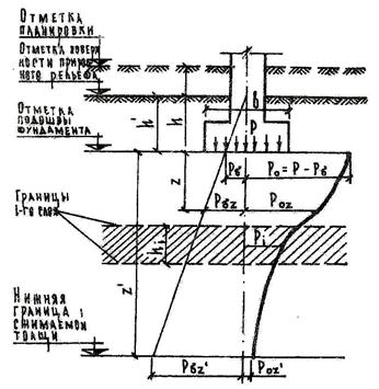 Рис. 3.10. Схема расчета осадки фундамента методом послойного суммирования для схемы линейно-деформируемого полупространства.