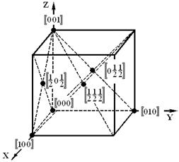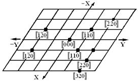 На рис. 6.1, а показаны символы нескольких узлов в косоугольной плоской сетке (индекс по третьей оси равен нулю), а на рис. 6.1, б — символы вершин, центров граней и центра элементарной ячейки, если одна из вершин ячейки принята за начало координат[1].