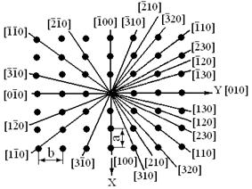 Символы некоторых направлений в плоской сетке показаны на рис. 6.4, а. Из рис. 6.1 и 6.4 следует, что, например, ряд [110] можно характеризовать и символом [220], [330] и т. п., но для определения символа ряда принято выбирать узел, ближайший к началу координат. Если индексы в символе ряда кратные, их можно сокращать на целое положительное число.